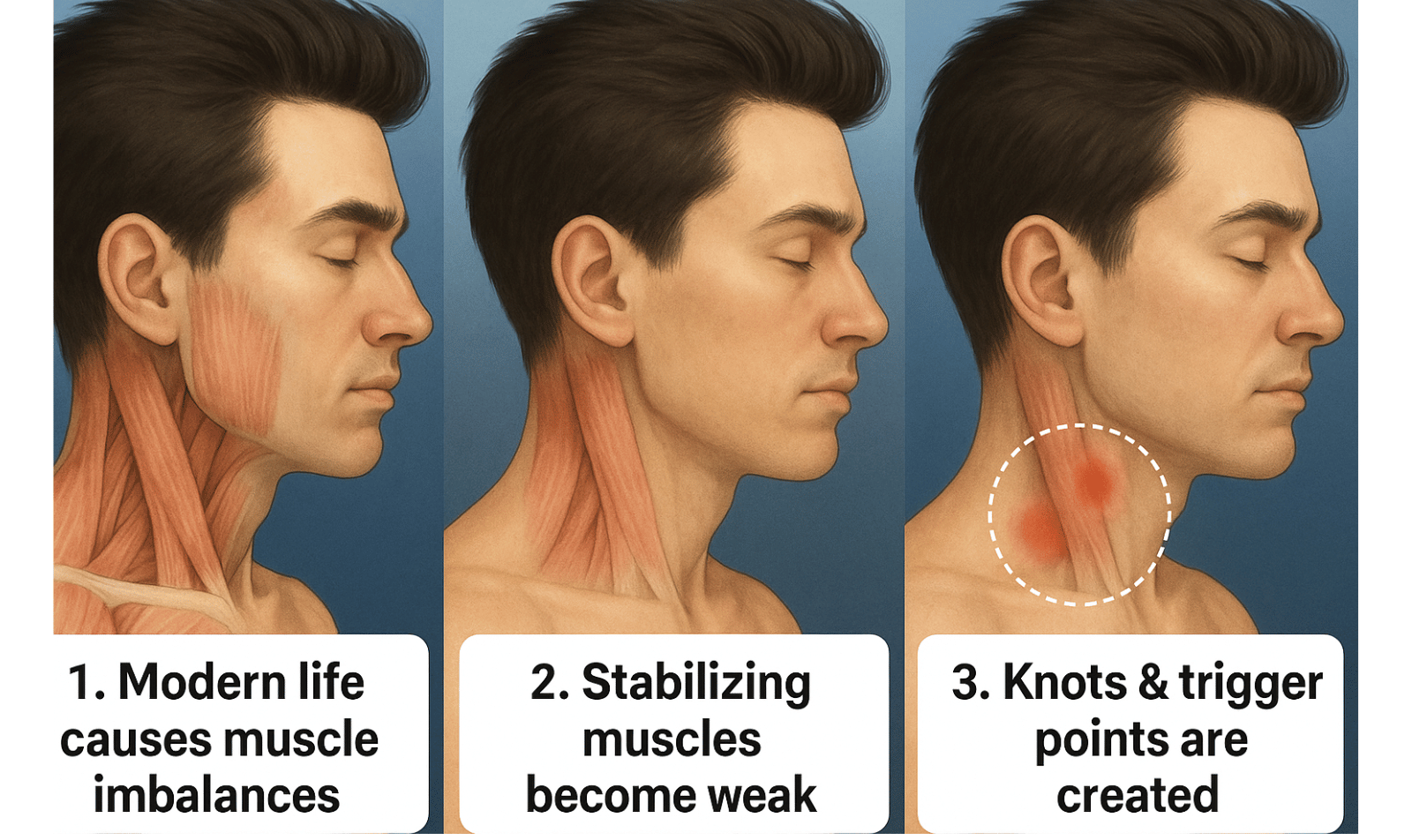 - Your neck and shoulder muscles have become weak and imbalanced from years of modern life - hunching over computers, looking down at phones, and sleeping in awkward positions.